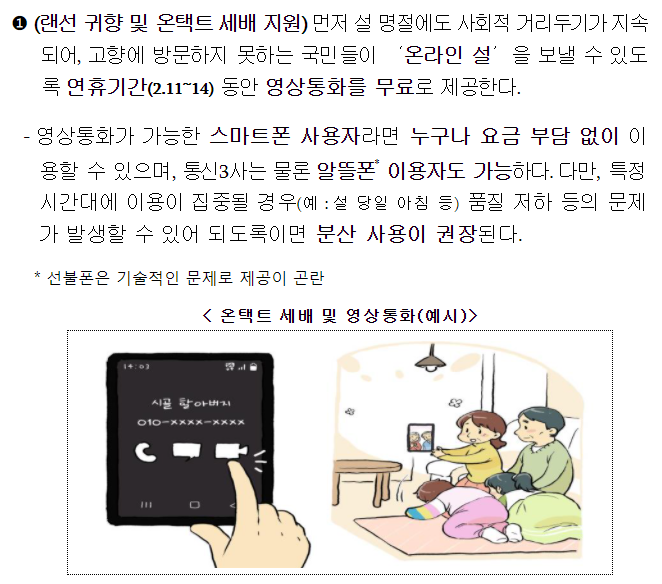2021년 코로나19 시대의 설 민생안정과 이용자 보호를 위한 통신 분야 지원의 일환으로 설 명절 기간 동안 무료 영상통화(랜선 귀향 및 온택트 세배)를 지원한다고 합니다.