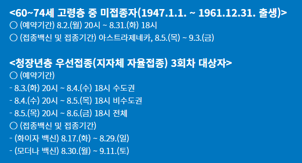 8월 3, 4, 5일에는 청장년층 우선 접종(지자체 자율접종) 3회차 대상자의 예약이 진행됩니다.