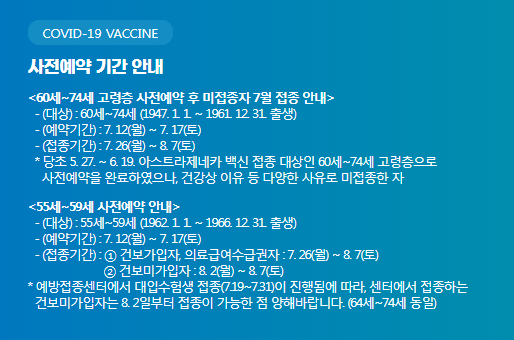 7월 12일부터 60~74세 중 사전예약을 했지만 일신상의 이유로 접종 받지 못한 자와 55~59세(1962. 1. 1. ~ 1966. 12. 31.)의 사전 예약 신청이 시작되었습니다.