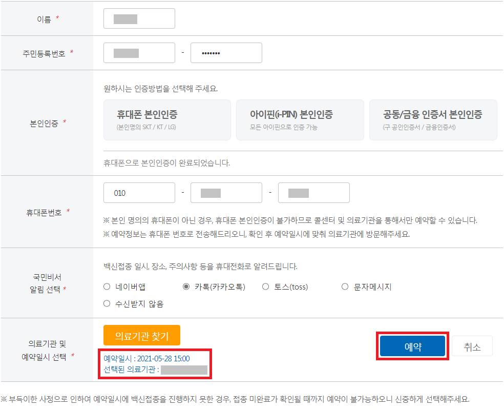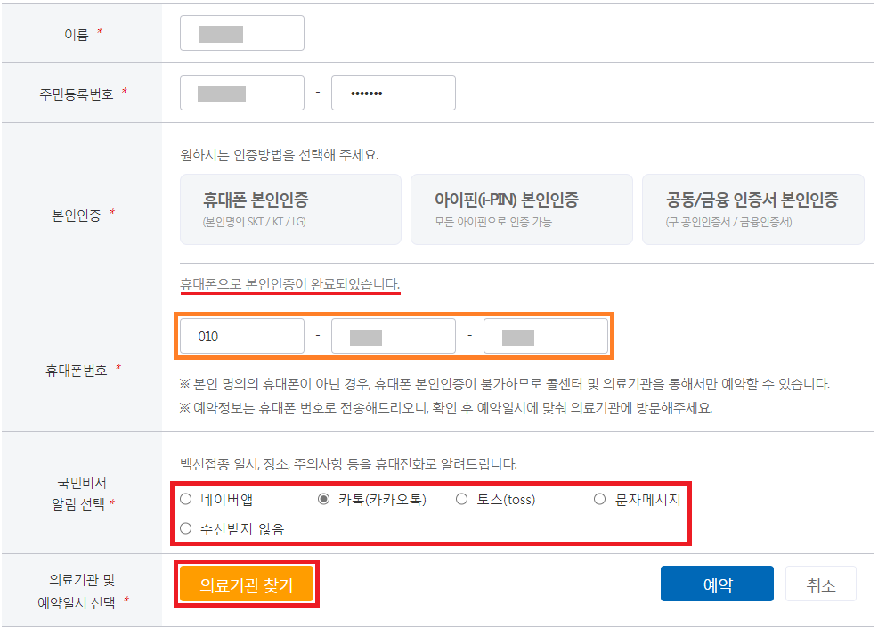 예약 정보를 받기 위해 휴대폰이 필요한데 이때 사용할 휴대폰도 인증을 하기 때문에 본인 명의로 된 휴대폰이 있어야 합니다.