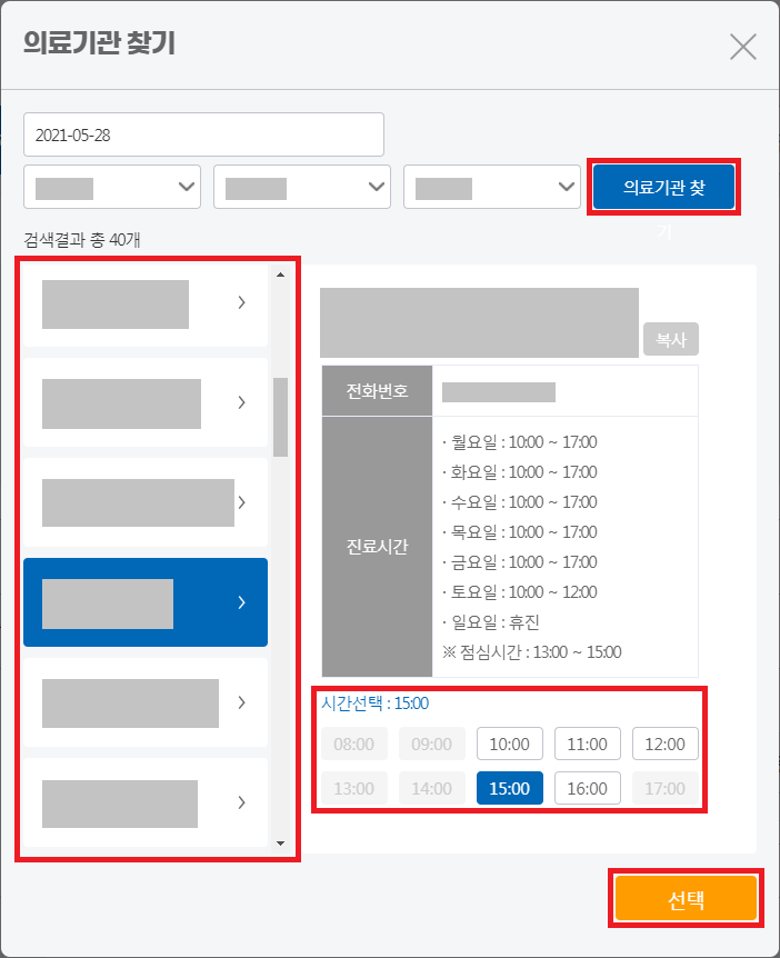 예약 날짜와 병원을 모두 지정했으면 선택을 클릭해서 의료기관 찾기 창을 종료합니다.