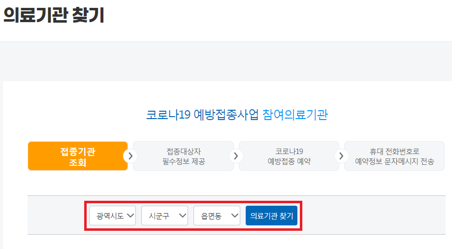 여기서 광역시도, 시군구, 읍면동을 지정하고 의료 기관 찾기를 클릭해서 해당 지역에 코로나19 예방접종이 가능한 병원이나 의원을 검색합니다.