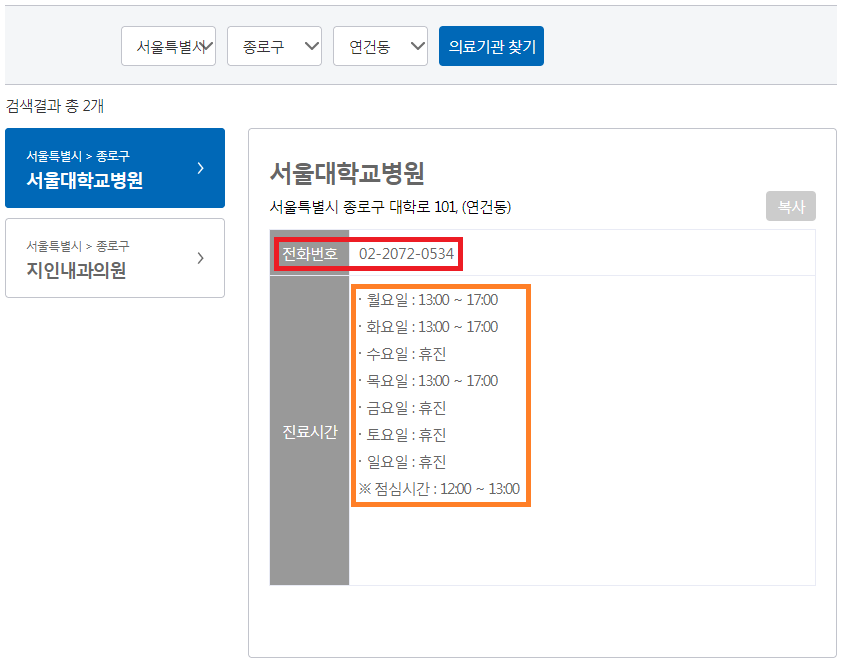 간혹 동명의 병원이 있을 수 있기 때문에 주소를 꼭 확인해 봐야 합니다.