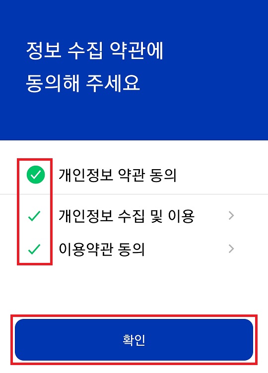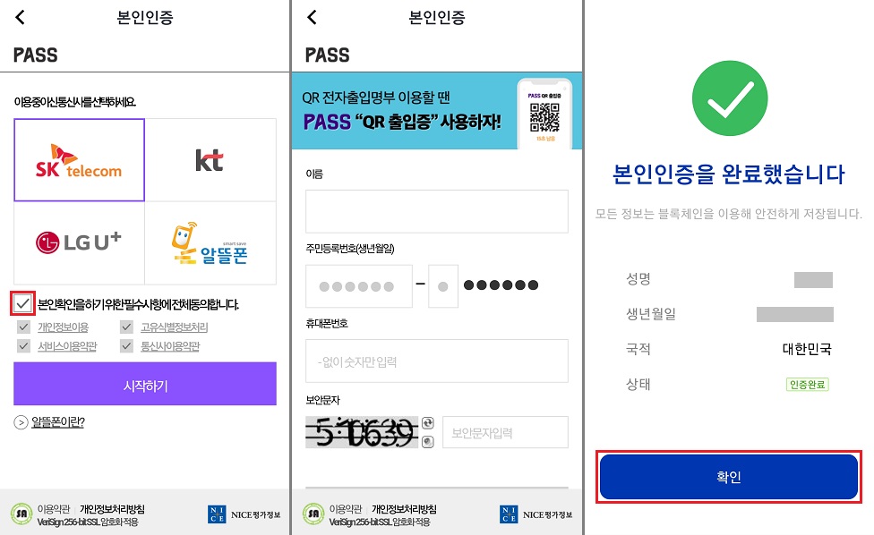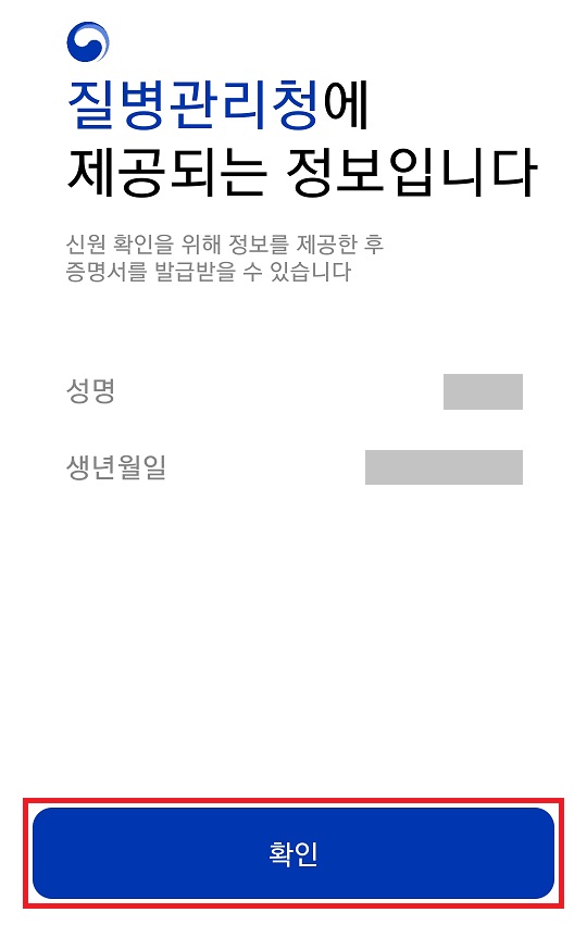 성명과 생년월일이 맞는지 확인하고 확인을 터치합니다.
