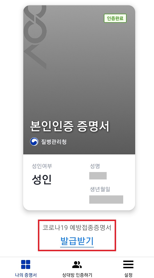 이후 본인 인증을 하면 코로나19 예방접종 증명서를 발행 받을 수 있습니다.