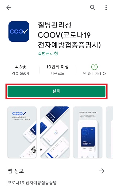 설치를 터치해서 질병관리청 COOV(코로나19 전자 예방접종 증명서) 앱을 설치합니다.