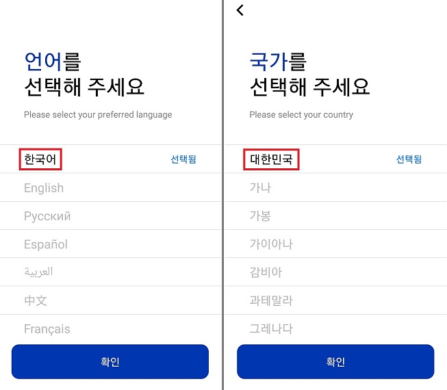앱을 처음 실행하면 사용할 언어와 국가를 선택합니다.