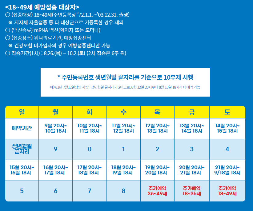 그 이후인 8월 21일 부터는 9월 18일 까지 18~49세 모든 대상으로 다시 추가 예약이 가능해집니다.
