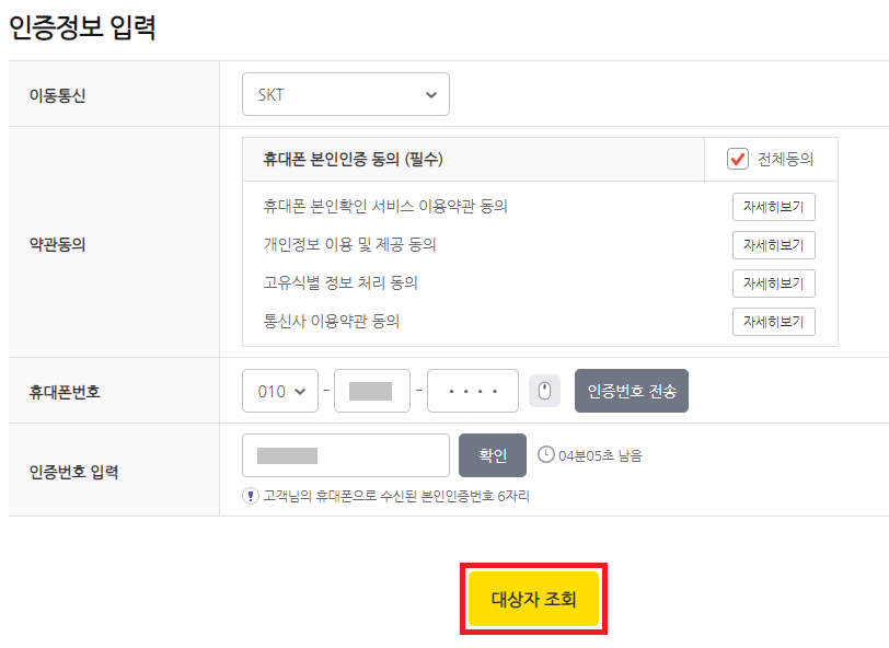 휴대폰 인증을 마친 후 '대상자 조회'를 클릭합니다.