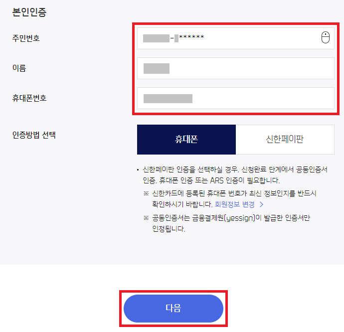 주민등록번호, 이름, 휴대폰 번호를 입력하고 다음을 클릭합니다.