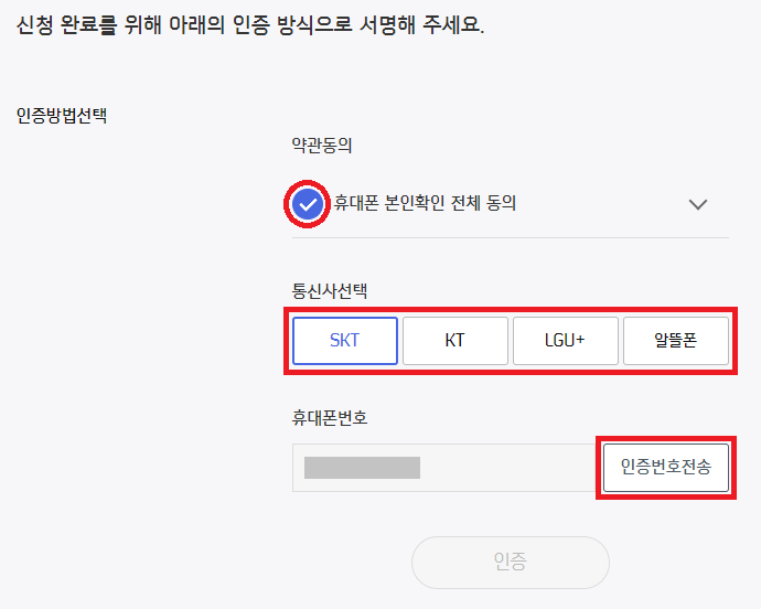 약관에 동의하고 통신사를 선택한 후 인증번호 전송을 클릭합니다.