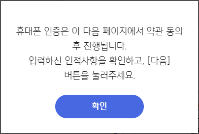 휴대폰 인증을 클릭하면 다음 페이지에서 한 번에 인증을 진행한다는 안내가 나옵니다.