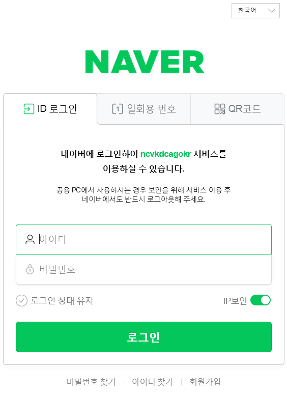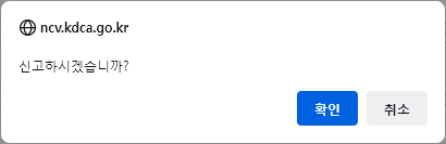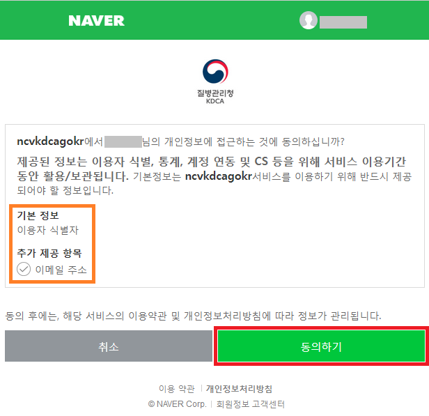 ncvkdcagokr에서 본인 확인을 위한 개인 정보 사용에 동의하는지 묻는 화면이 나옵니다.