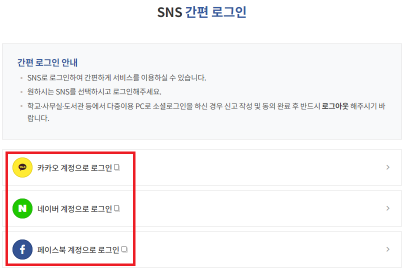 카카오, 네이버, 페이스북 중 아무 계정을 사용해도 됩니다.