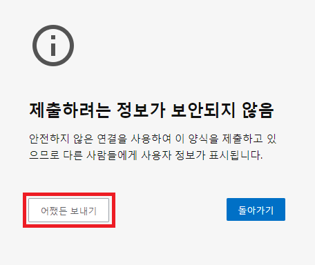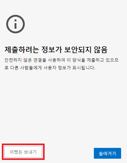 제출하려는 정보가 보안되지 않음이라는 경고가 나왔는데 '어쨌든 보내기'를 클릭해서 계속 진행했습니다.