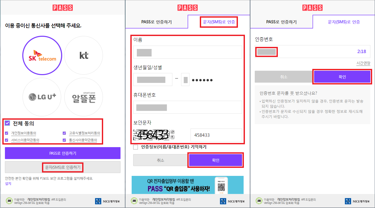 PASS 인증과 문자 인증이 있는데 전 문자 인증으로 진행을 했습니다.