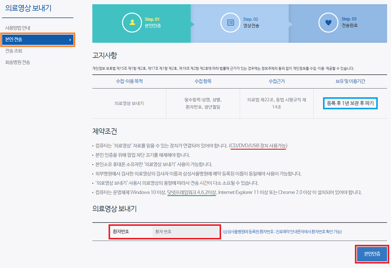 삼성서울병원에서 발급받은 환자 번호가 있어야 진행이 가능합니다.